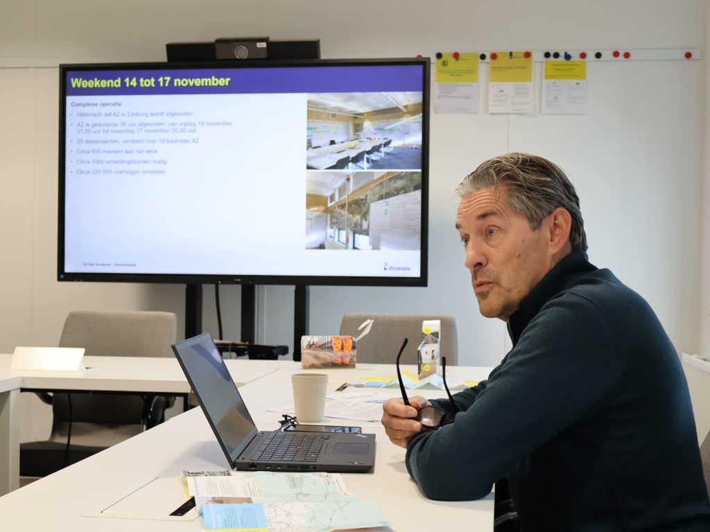 Een andere manager van Boskalis doet zijn werk vanuit een kantoor op het Nedcarterrein in Born, met uitzicht op de A2. Zijn naam is Rembout van Gemert en hij is verkeersmanager. Dat betekent dat hij onder andere verantwoordelijk is voor alle borden die dezer dagen nodig zijn voor de verkeersafwikkeling. Die lagen opgeslagen in een magazijn in Brabant en staan inmiddels op hun plek langs de diverse wegen. En die wegen zijn niet zomaar uitgekozen, legt Van Gemert, staande langs de A2 uit. Door middel van analyse is gekeken welke wegen wel en niet geschikt zijn om het verkeer op te vangen. Ook zijn er heel wat verkeersregelaars. Die staan niet alleen op van tevoren vastgestelde locaties, maar kunnen ook mobiel ingezet worden. De aansturing gebeurt dit weekend vanuit een speciaal daarvoor ingerichte centrale bij Nedcar.