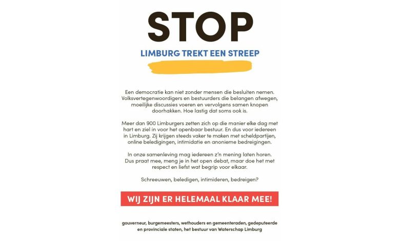 Bestuurders in Limburg laten zich horen met een advertentie tegen dreigementen en intimidatie. Meer dan negenhonderd bestuurders, onder wie burgemeester en wethouders, zeggen dat zij klaar zijn met scheldpartijen en bedreigingen.