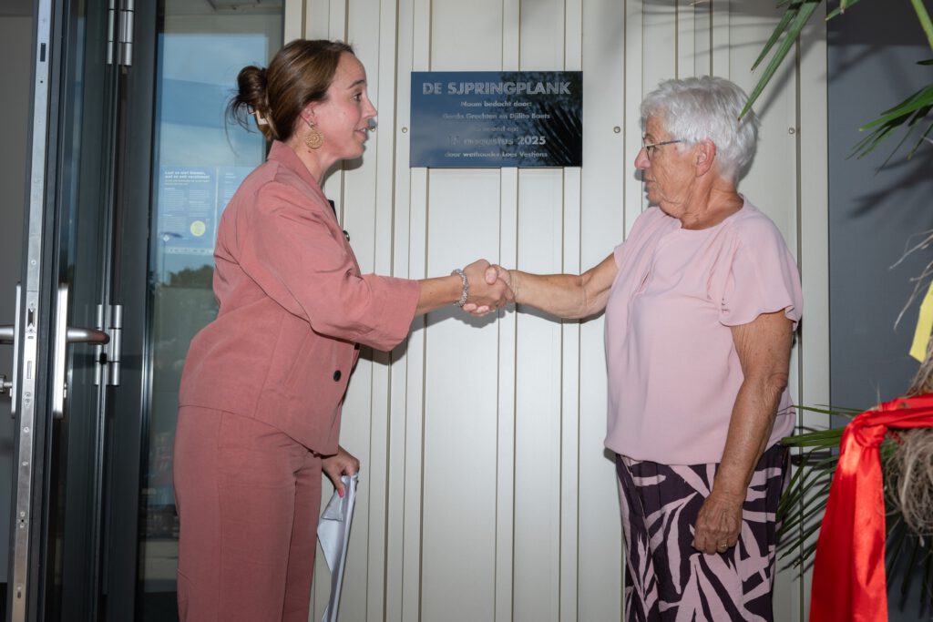 De naam ‘De Sjpringplank’ werd bedacht tijdens een prijsvraag. In totaal kwamen 47 namen binnen bij de gemeente. Winnaars Gerda Grachten en Djilito Baets bedachten de huidige naam en mochten daarom samen met de wethouder het gebouw officieel openen. Djilito mocht het lintje doorknippen en mevrouw Grachten het bordje onthullen. Daarna kregen nieuwsgierige inwoners de kans om een rondje te maken.