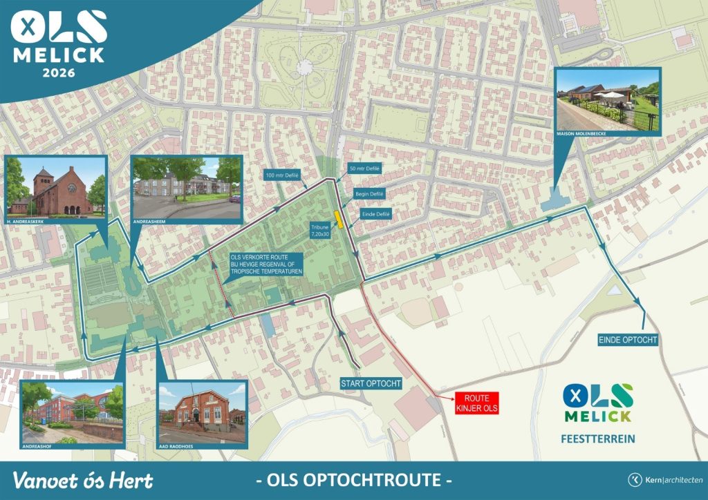 De optochtroute voor het Oud Limburgs Schuttersfeest (OLS) 2026 in Melick is bekend. Tijdens een inwonersbijeenkomst op donderdag 15 januari kregen aanwezigen als eersten inzicht in het parcours. De route is ongeveer twee kilometer lang en loopt dwars door het centrum van het dorp.