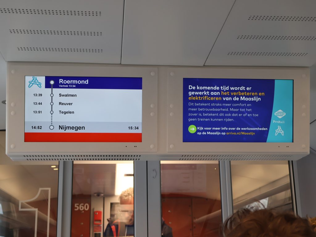 Het treinstel dat in Roermond te bewonderen was, viel van binnen nog een beetje kaal uit. Bij diverse andere Arrivatreinen zijn de wanden aangekleed met foto’s en toelichtingen, die verband houden met de naam van de trein, bijvoorbeeld de Cauberg en de Mookerheide.