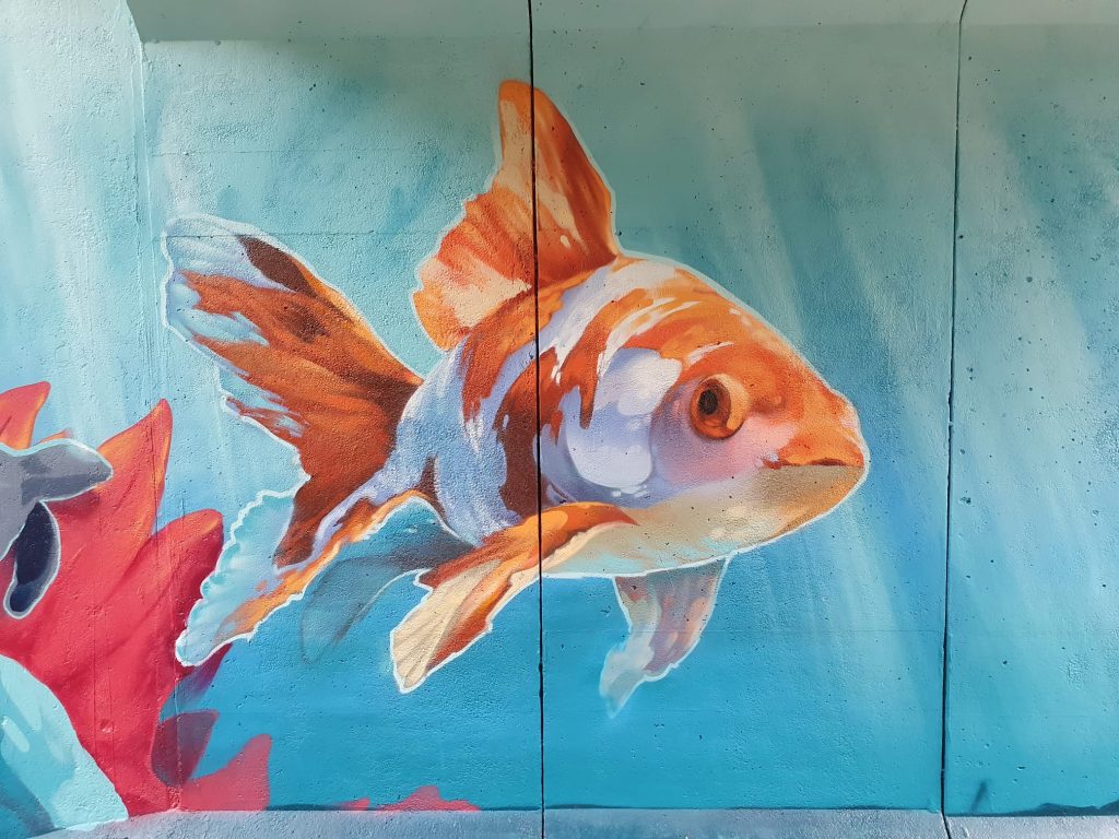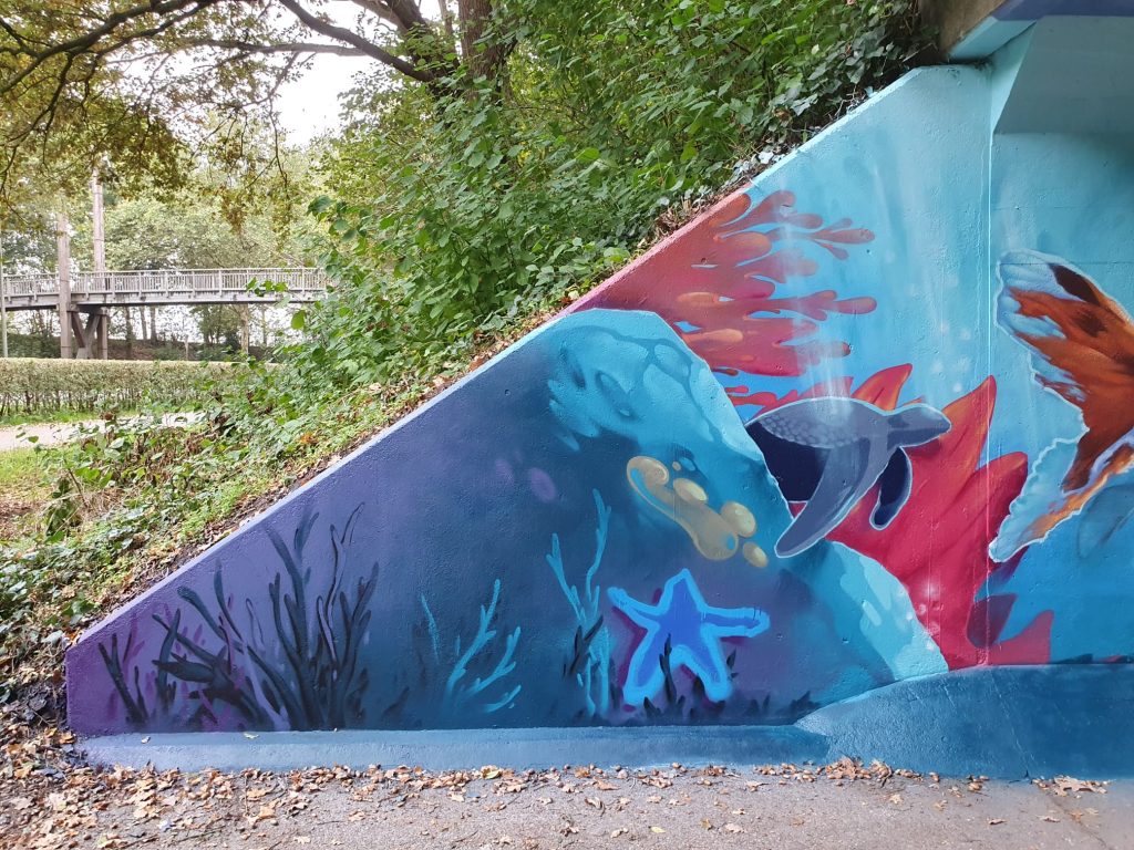 Voordat het spuiten kon beginnen, maakte de buitenploeg van PSW het tunneltje schoon. Daarna ging de groep aan de slag met het maken van de muurschildering. Deze ideeën zijn uitgewerkt op de muur.